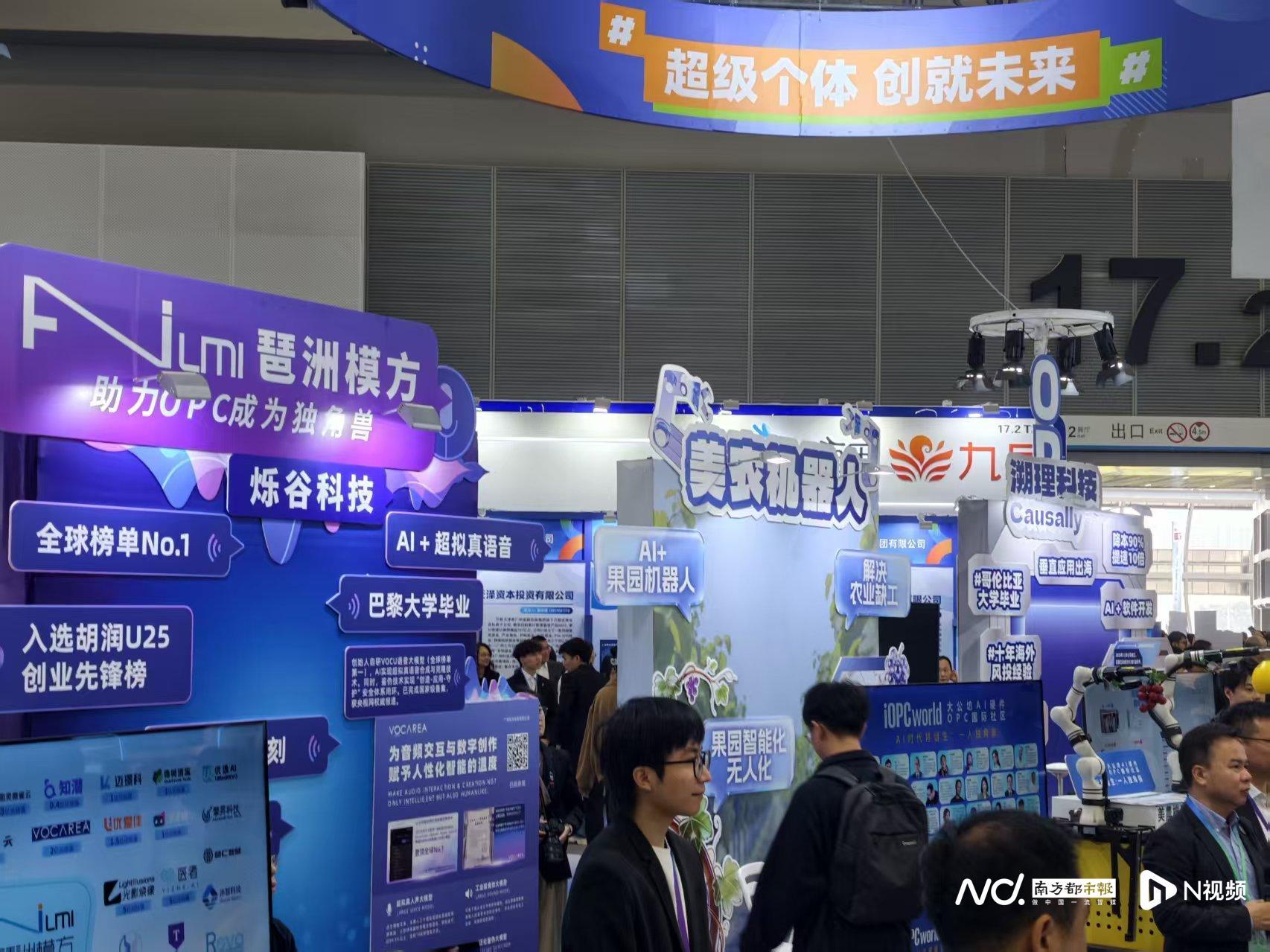 今年“创就未来”专区首次将“OPC创业者”作为独立服务群体,展示了广州、深圳、佛山、东莞、珠海等大湾区城市10个优秀OPC项目,涵盖超拟真语音、果园机器人、软件开发、情感伴宠、健康检测、动漫短剧、中小学智慧教育等AI应用场景。